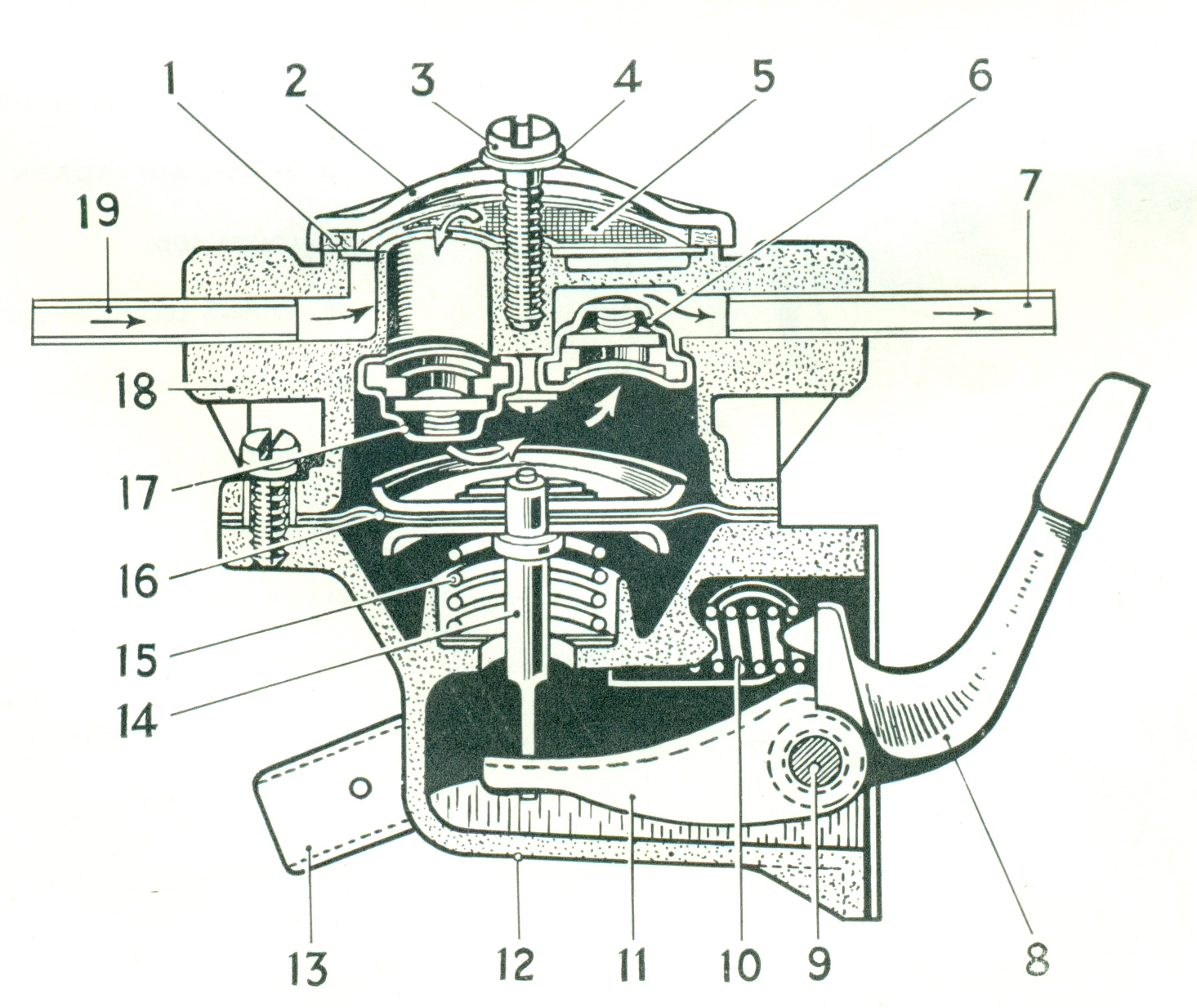 Assembled in the upper body are two valve assemblies (6 and 17). one being opened by suction. and the other by pressure. Both valves are held in position by a common retaining plate secured inside the upper body by two screws.