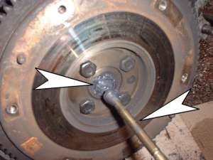bladed screwdriver against one of the flywheel