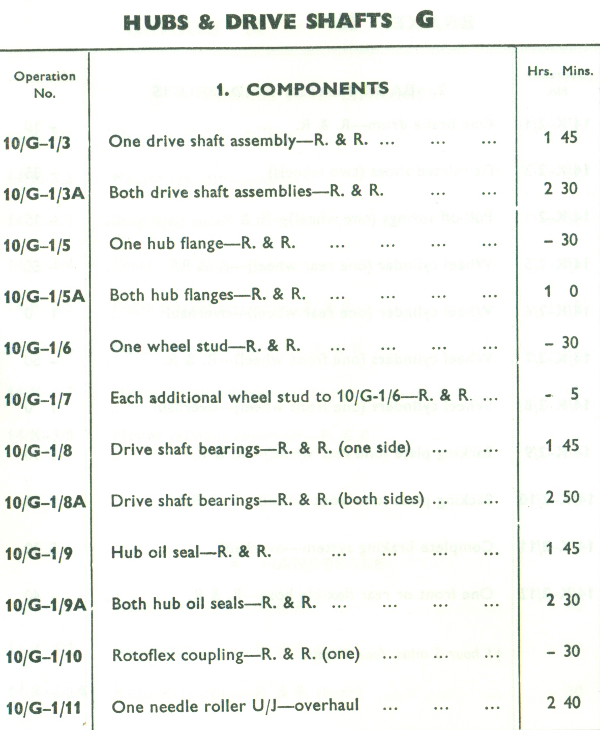 G: Rear Hubs & Drive Shafts Man Hour Schedule